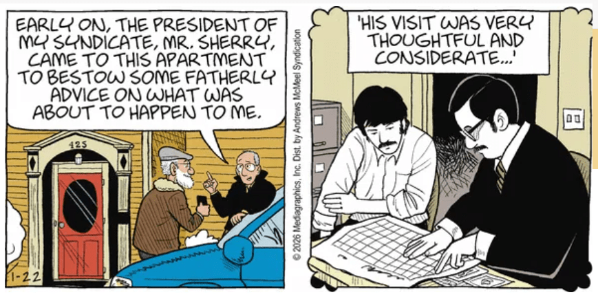 I’m glad for that explanation, because Lord knows Tom Batiuk didn’t provide one. And it seems to check out. Wikipedia says “some of the more notable strips syndicated by the company include Pogo, Dennis The Menace, Funky Winkerbean (snort).” So this company would have been Batiuk’s first publisher, and Sherry his employer’s president.