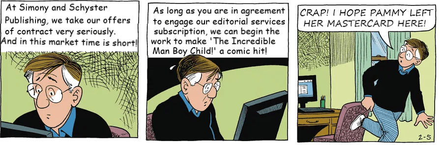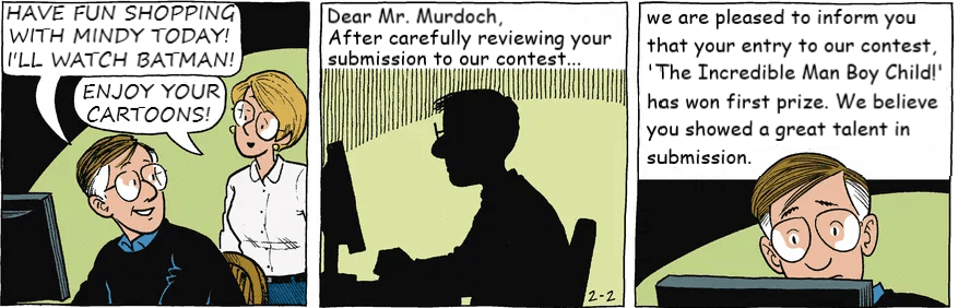 January 27 ,2025: Batton sucks at being an art teacher, so he badgers the local paper into letting him draw a cartoon. He meets with a syndicate, NEA, which gives him some advice on how to turn it into a comic strip.