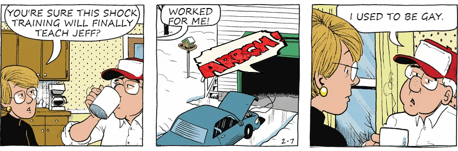 I’m glad for that explanation, because Lord knows Tom Batiuk didn’t provide one. And it seems to check out. Wikipedia says “some of the more notable strips syndicated by the company include Pogo, Dennis The Menace, Funky Winkerbean (snort).” So this company would have been Batiuk’s first publisher, and Sherry his employer’s president.