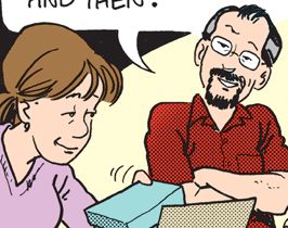 To summarize what has been pointed out here and elsewhere in the comics mockage sphere, Susan is a possibly mentally unbalanced individual, and Les is a complete and utter asshole. She’s cleaning out her desk because of him, and they’re both joking about it. Well, when the “writing” becomes too vexing, we can always critique the “drawing”: Les has never looked more punchable than he does in panel 3, while Susan’s bashful smile makes her look like Droopy Dawg.