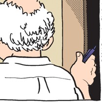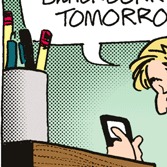 The odd perspective in panel one of today’s strip is no doubt meant to draw attention to the cup filled with pens and pencils atop Tony’s quaint and homey roll-top desk. It is one of these writing implements (and not a flip phone as I first thought) that Tony wields, and I hoped that he was sneaking up on “Boy Lisa” to “stab him in the eye” as suggested by Epicus Doomus. It’s been interesting to follow the comments here this week: it’s an unscientific sampling, to be sure, but the bottom line is that, paper-based or digital (or both), you’re going to use what you’re comfortable with.