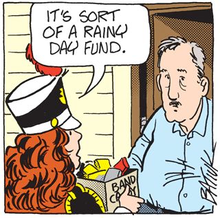 Batiuk should save himself some time and aggravation by creating a new character. Call him “Befuddled and/or Put-Upon Westview Resident”, and have him serve as the foil for all doorbell gags involving “canvassing”, band candy and band turkey sales. Today’s generic neighbor is merely a moustache and chin away from Maddie’s customer from last month.