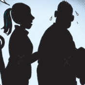 Perhaps feeling at last remorseful for having worked him so hard, Fitness Girl feigns concern for Funky’s well-being, even patting his flabby, sweating back as she sets up today’s punchline.