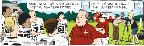 Today’s strip is somewhere in between. In a sense, the team picture is “the ‘before’ picture” as it depicts the team before the season starts (though the ‘Goats have already played, and presumably lost, their first game). Does Coach summon them again at the end of the season for a (not optional!) “after” picture?