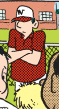 What’s really unsettling is that the mystery assistant coach is back again today…in the exact same pose! It’s weird which things Batiuk chooses to be consistent about. Maybe it’s not even a live person; after blowing their budget on those swell Riddell pro-grade helmets, the school has no money left to hire additional staff, and the team is forced to make do with a mannequin.