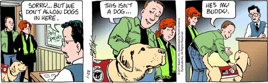 Having exhausted the roster of cartoon cavemen, TB revisits a couple tropes from past Wally strips. First, the “Hey, you can’t bring that dog in here” guy, as seen in a restaurant a few years back. Wally explains that Buddy is “my service dog.” But according to the “Dogs and PTSD” page on the VA website: