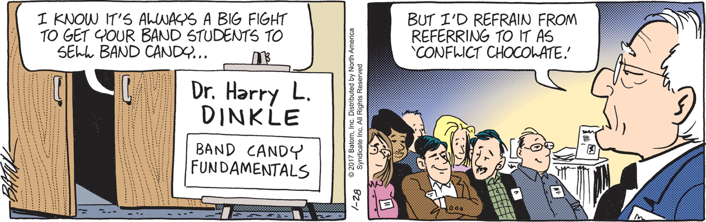 Just as he’s outstayed his welcome around the halls of Westview High, Dinkle has lingered way too long in Funky Winkerbean, Act III. I’d supposed Harry went around giving “band candy motivational speeches” to fellow music educators or Becky’s current students simply as a way to keep busy, but it turns out he’s a compensated shill for Big Chocolate. He rushes home to share his big news with his wife Harriet (we must assume that’s Harriet, though she now looks like a 53 year old, instead of someone who’s been married 53 years).