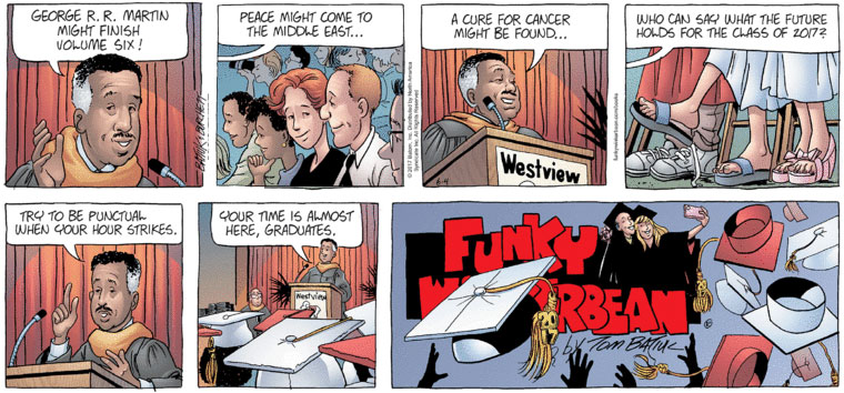 The panels in today’s strip read at least as well in reverse order. To paraphrase Nate, who can say what the past four years held for the Class of 2017? The only glimpse we get of WHS ’17 is a few pairs of feet in panel 4 (nicely-rendered, by the way, and feet are hard to draw) . Recall that Cody and Owen handed over the reins of WHS’ in-house media operation directly to some freshmen. I’m supposing Tank and Conner to be underclassmen. As befits these anono-grads’ status, their commencement is held not in a stadium, with drones, but rather in the auditorium, listening to Nate name-check the author of A Game of Thrones.