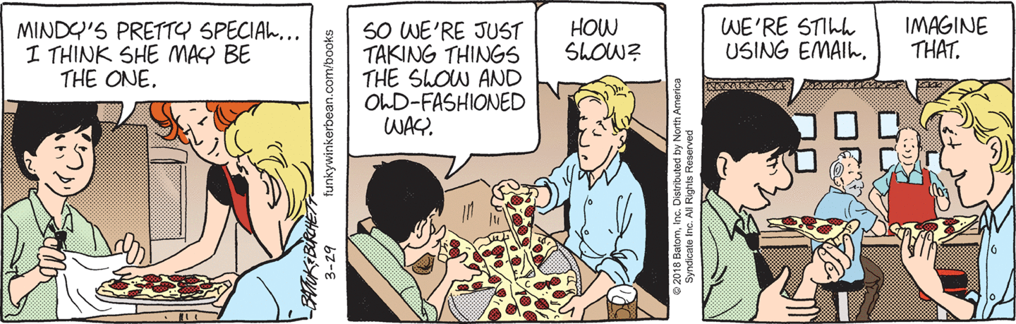 So, Pete and Mindy are “taking it slow” but Mindy complains if he takes his time responding to her? I know consistency isn’t Tom Batiuk’s strong suite, but he ought to try keeping things together two days in a row.