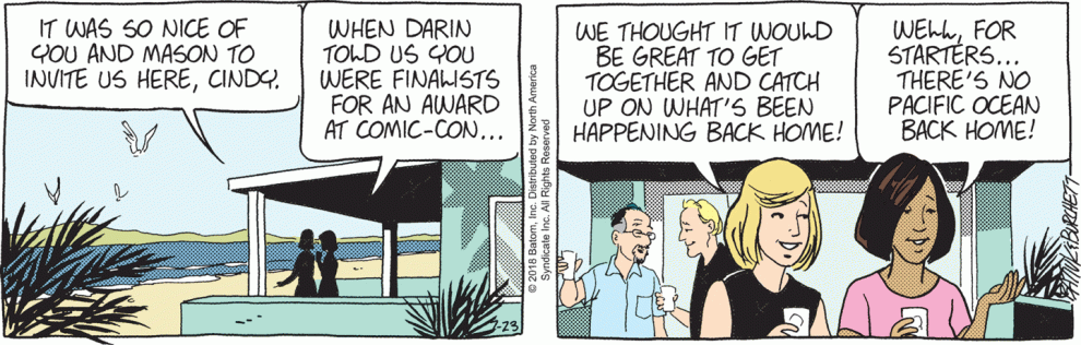 So, what do we have here? I’m honestly dying from boredom just looking at this one. I do like the drawing of the house and the environs in panel one–it’s simple and slapdash but it’s nice, including the squiggle birds and the hinted-at ocean. A decent looking house right on the beach–Starbuck Jones has been very good to Mason. And it’s nice of Les to change from the yellow shirt he was wearing yesterday to a blue version of the same thing. I suppose he did that on the ride over, and thank you to Tom Batiuk for not showing that, and also not showing Mason saying, “Wow, Les, you’re really ripped. I could get you into the movies easily, as a sensitive and caring guy who ends up with the girl in the end!” And also not showing Les being all humble and yet unable to say No. So that’s three good things Tom Batiuk did in just this one episode!