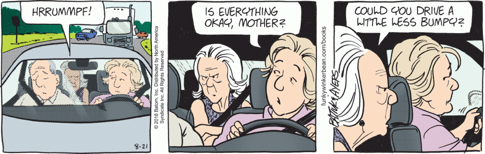 That KOTH episode that you reference is full of exactly what today’s strip contains, old women complaining unreasonably. While today’s strip simply has Holly’s mom grumbling and Holly grimacing, KOTH finds Hank reacting befuddled and exasperated by the old women complaining at him, complaints that manifest into such ridiculousness as being angry with him for not liking cucumber sandwiches or for mistaking a ceramic otter for a seal (“seals are trash mammals, everyone knows that!”).