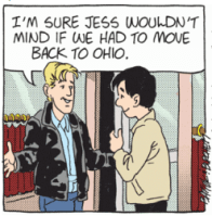 Yeah, this one seems sort of out of sequence or something. It’s weird how some kinds of continuity matters to him while some doesn’t at all. Boy Lisa and Jessica are married and have been for at least twenty years or thereabouts, it’s totally inexplicable as to why she’d STILL be out there having fun in the warm California sun while her husband and mother-in-law are toiling away in Ohio raising that kid of hers. It’s bizarre. Some continuity seems to matter to him (Jessica still being in CA) yet some doesn’t matter at all (Boy Lisa and Jess as “young kids just starting out”). I don’t get it either, but if they aren’t careful they’ll end up having another Cory on their hands before they know it.