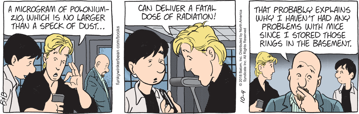 Since Batiuk is half-informed and half-assing it, it makes sense that he’s going to make the same stupid fucking mistake Brooke McElnazi did once when defending his confusing “way station” with “weigh station” and get all chirpy about the ignorance of people who say that the alpha particles would have been stopped by the glass and that the polonium would have long since decayed to differently-harmful lead.