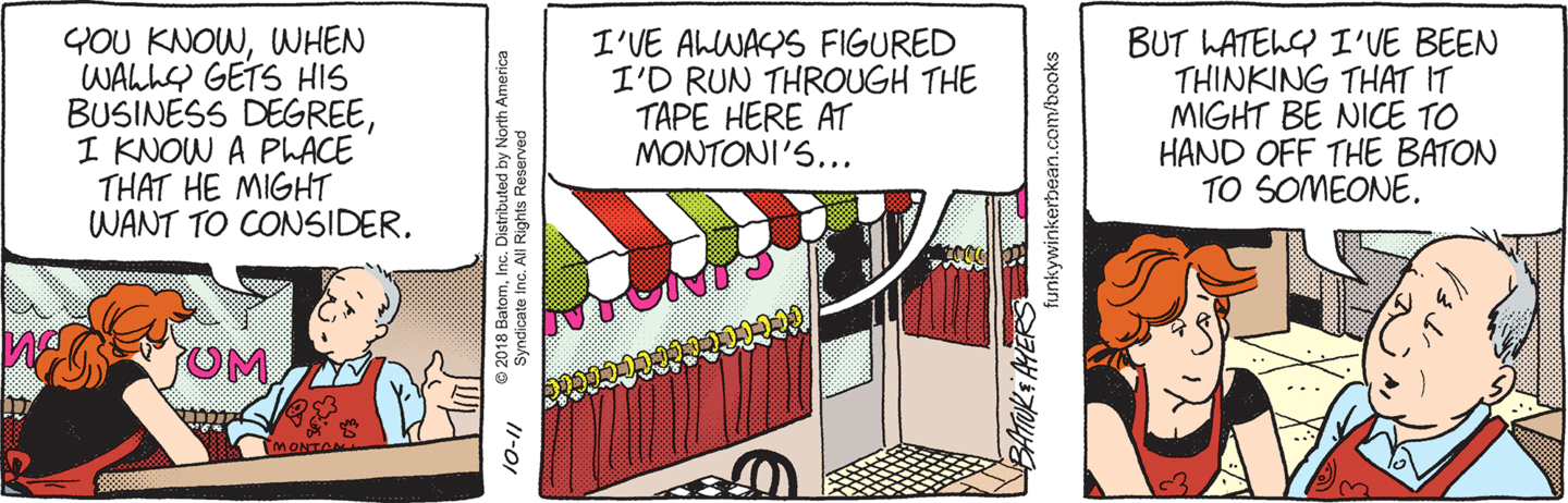 What is even the finish line here? Death? Montoni’s going out of business? Neither one makes any real sense. I’d be shocked if Batiuk didn’t just decide on “handing off the baton” being the punchline, and then needed a leadup to that.