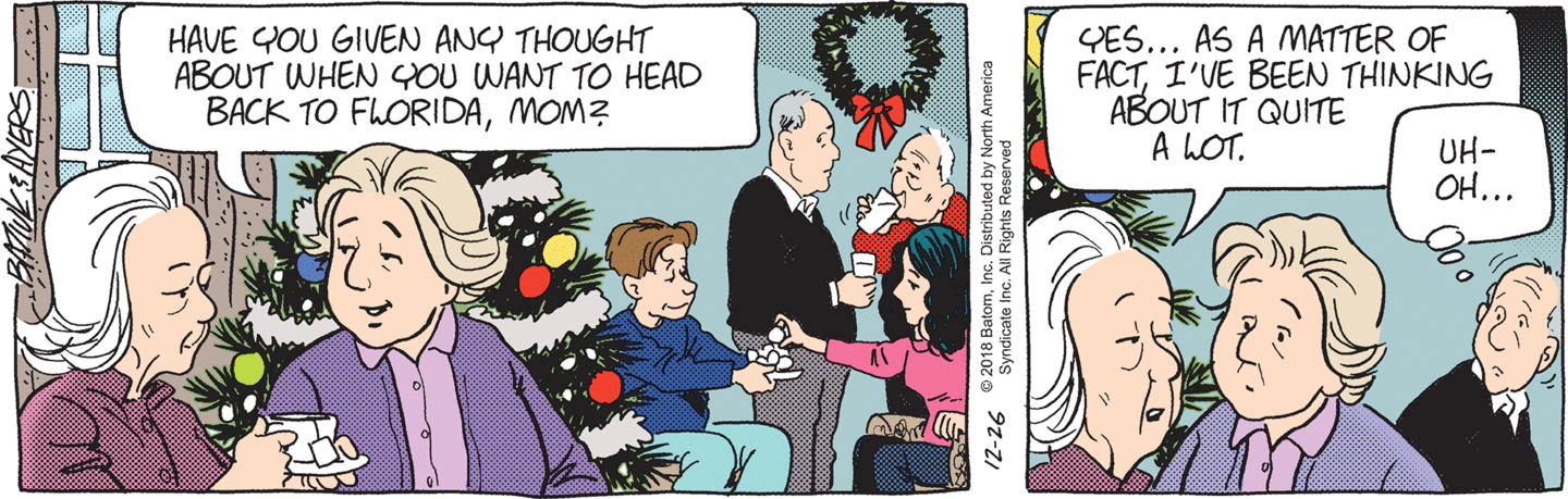 Well, it may be the 26th and all but yuletide festivities are still in full swing over at Winkerbean Manor aka The House That Tony Built. Apparently Holly’s mother has been staying there this whole time, as that whole “band reunion” thing appears to have been nothing more than an excuse for Holly’s mom (does she even have a name?) to make Funky’s depressing life even more of a living hell. Despite it being a pretty tired old trope (mother-in-law gags are as trope-y as it gets) I was not altogether un-amused by Funky’s reaction there in panel two, nor by his sidewards comma eyes in panel one for that matter. Maybe it’s my misguided Christmas cheer, but IMO this is at least a baby step up from seven week PTSD arc or watching a befuddled amputee bumble around haplessly for a week, so there is that. I mean sure, it isn’t “good” by any measure but given how abysmal 2018 was overall, I’ll temporarily take it.