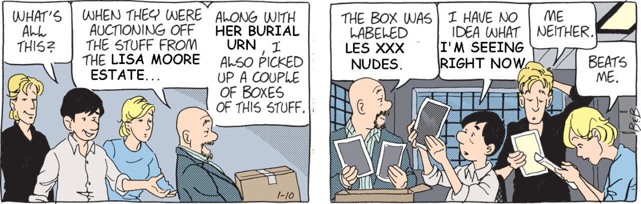 It’s not just the facial expression, it’s that Batiuk obviously thinks it’s how the reader feels too. That somehow “there’s a box of old comics in someone’s attic” is some kind of wondrous dramatic moment for his audience.