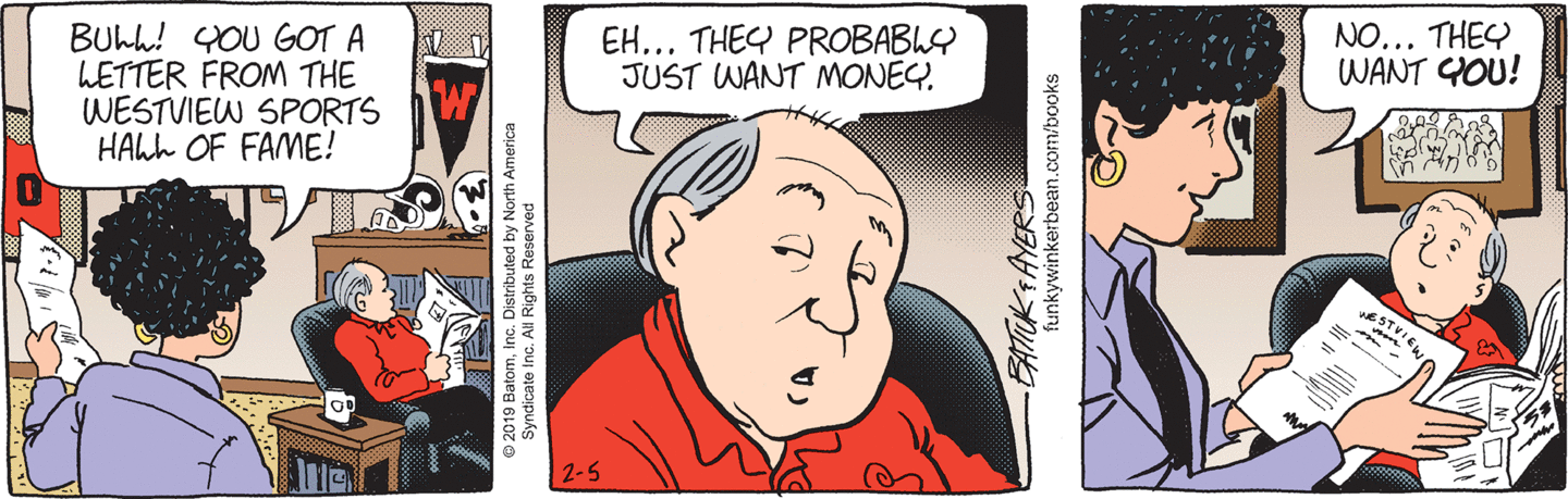 This is really idiotic, and shows another thing Batiuk knows nothing about. A high school athletics hall of fame would nominate members when they were seniors, I would think, and not decades later when many of them would have died.