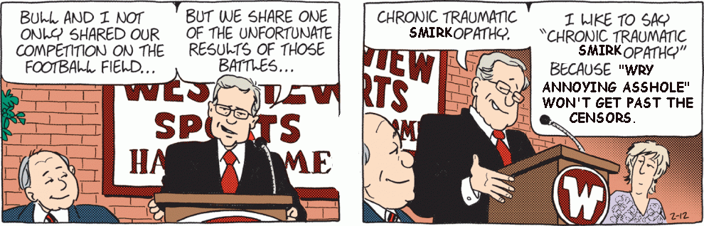 Is he nuts? This is a terribly tasteless joke, even by FW standards. It’s not a delightful benign condition that leads to bouts of adorable forgetfulness, it’s a horrible irreversible brain disorder. I’ve always felt that the original CTE arc was just cruelty for the sake of it and this one proves it.