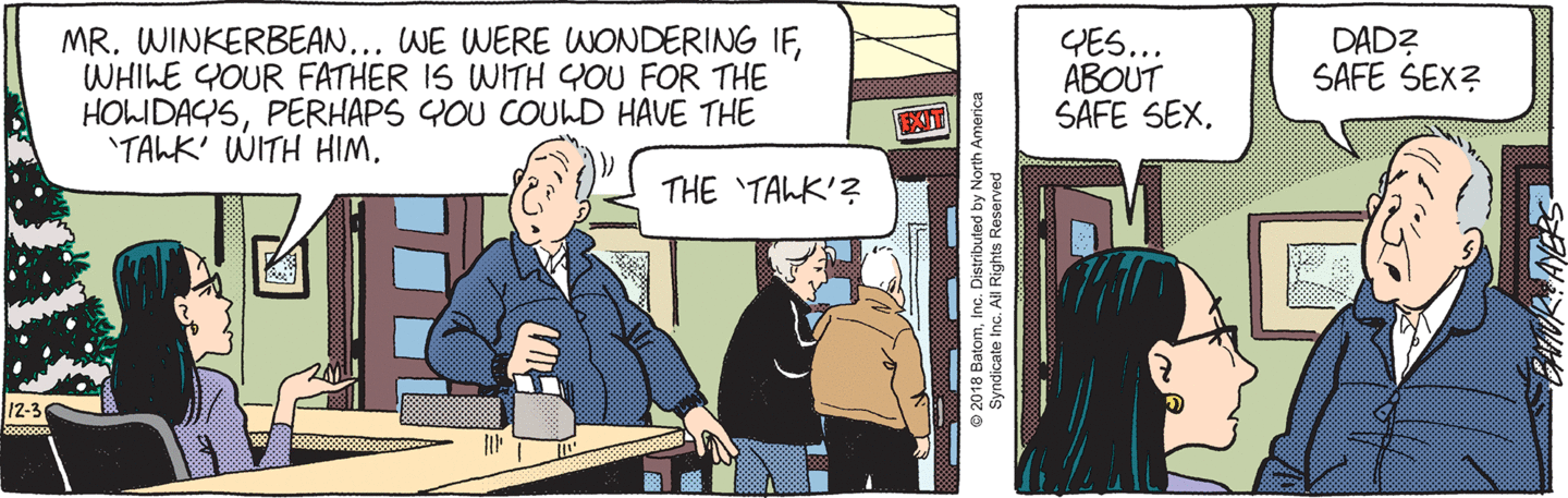 The sight of a relaxed, grinning Funky instantly piques Holly’s curiosity. Funky’s got reason to smile: he’s managed to avoid having to deal with his cranky mother-in-law and with his formerly senile father. Hopefully the start of a new calendar year means that Mort can once again get “those little purple pills.” Said arrangements have been made “off camera.” so we don’t know what Elvis–uh, Melinda thinks about the whole thing. Neither do we know if, since he’s not technically Melinda’s next of kin, he’s even authorized to not only consign Melinda to Bedside Manor but also have her bunk with his old man. Although in a nursing home where the receptionist is allowed to discuss sensitive information with family, I guess anything goes!