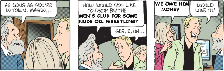 You know, if somehow you’d made it this far reading this strip and still expected some level of quality and for it to make sense, today’s strip would confuse you. Like, Mason is a star because of comics. Harry helped him prepare for the biggest role of his career. Interacting with his fans would be good for his image. But sure, let’s have Mason be the sole person in this strip who isn’t obsessed with comics, all for the sake of hilarity. Wait, something’s missing . . .