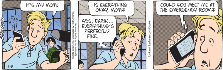 Might not have been intended by TB, but that transition from “everything’s fine” to “emergency room” exposes the entire premise of this strip. In a nutshell.