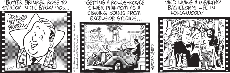 Well, that might explain why today’s strip seems like it should have appeared on Monday. Maybe instead of Cindy blathering away as she and Jessica sit in front of their editing station, we’re actually “seeing” some of Cindy’s documentary. Which would make this the first time we’ve been allowed to see actual footage from any of the Funkiverse’s myriad movie projects. However, nothing can explain how a silent film star “rose to stardom in the early 40’s“.