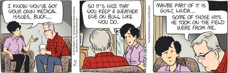 I’d say it’s amazing that Batiuk never developed any empathy for Bull over the last 47 years, especially when he seemed to have been trying to redeem and humanize him since the beginning of Act 2, but he really doesn’t have empathy for any of his characters. They’re just vessels for him to write about something that he thinks will garner him attention. Bull has football and its CTE. Wally has The War and its PTSD. Funky has alcoholism. Becky has disability. Lisa has cancer and death. Les has widower’s grief. They’re not characters. They’re just tokens to remind you of subjects that Batiuk thinks are serious.