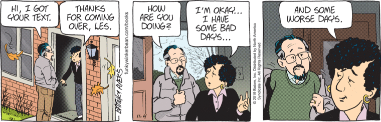 So did Les stop communicating with “work spouse” Linda when she retired to take care of Bull so that she had to resort to texting him? How else to interpret what appears to be the first instance in this strip of someone not just showing up at someone’s door unannounced?