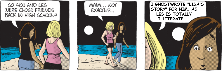 Oh, yay. Just what this strip needed. Les Moore-centric sexual jealousy. It’s like Batiuk thought “Oh, so people don’t like Les? They’re tired of Lisa’s Story: The Movie: Redux? I’ll show them! I’ll have a woman fretting and worrying about Les sleeping with someone hotter than her! I’ll force everyone to think about Les Moore’s sex life! Finally, I will have my revenge on the world that wronged me! All will suffer!” And then he cackles for ten minutes.