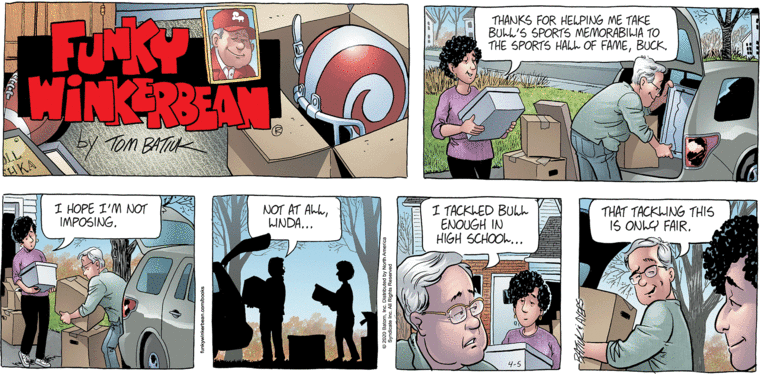 Thanks for the expository dialog, Linda! Apparently lugging Bull’s old garbage to the dump WHS Sports Hall Of Fame makes up for concussing him all those times. In my opinion Bull is the clear loser in that deal, which is certainly no surprise. I really wish he’d stop dragging this out, but then again dragging things out is kind of what BatBrain does, much to everyone’s disgust. And how come Buck is all wry and cheerful while Bull was all unpredictable and squirrely? It’s like HIS CTE comes and goes. Sigh.