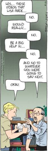 Tom Batiuk spends three weeks on a subject as boring as VHS-to-DVD-transfer, and then completely ignores it when it’s relevant to the plot. And for no reason! This week’s story works the same if the contents are on DVD. It’s like he’s giving a middle finger to anyone who’s trying to follow his oh-so-realistic story. And he does it all the time.