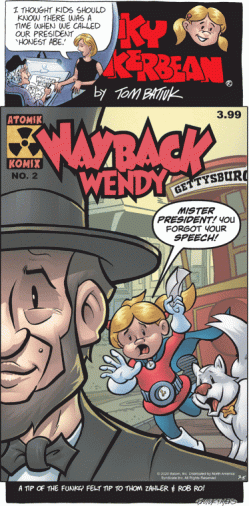 “Reality bubbles” in most cases are inserted at the bottom of the vertical frame, almost as an afterthought. Today’s bubble in at the upper right hand corner, and is so large it renders the comic’s title as “KY KERBEAN” (what a silly name for a comic strip). All this real estate so that Batiuk can throw shade at Trump, with a jab vague enough that he could write it a year in advance and folks would still smirk knowingly like Ruby is smirking here. As for the Wayback Wendy cover itself? It pretty much gives away the resolution of the story, doesn’t it? Looks like successfully delivers the speech (written on an envelope, natch) to Honest Abe in time not to disrupt history.