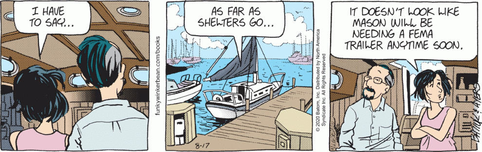 Yep. It’s a nice boat, but definitely not at all what Mason or Batiuk claimed it to be. It’s certainly not a temporary shelter for 7. Also, we didn’t see L*s or Marianne take her purse. Shouldn’t she be at least mildly upset about not having her cell phone to make calls to *all* her contacts, credit/debit cards, and ID? Finally, I can’t believe I’m about to post this, but a “thank you” to L*s seems to be in order here. Definitely more so than that nonsensical FEMA joke.