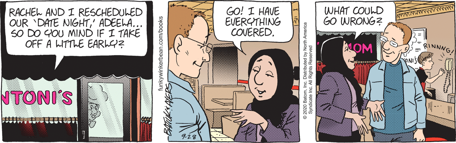 Does any of the last two weeks make any sense chronologically? I assumed that the 9/14 thru 9/25 strips were all in the same laugh-filled afternoon/evening, as Rachel left class, couldn’t find Wally, he and Adeela came back from the BMV, everyone lovingly joked about Crankshaft.