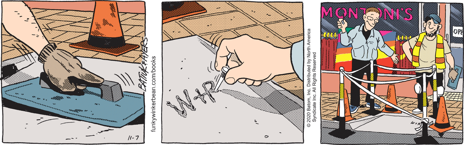 In today’s strip, Wally finally gets around to memorializing his daughter Rana’s (R for Rana) gravesite, her having been buried underneath the Montoni’s sidewalk after she died of Ultra Breast Cancer she caught as a child from a landmine in Afghanistan. This all happened off-panel a few years back when Funky was shown working out in the gym. You can tell how moved Wally is by the thought of his late daughter since his face is literally melting off from sadness.