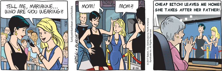 Besides, the Hollywood sign wasn’t her dream; it was her reality! She grew up near it! She couldn’t go anywhere without it looming over her! It wouldn’t impress Marianne at this point – it would be just another ordinary thing from her childhood. That Tom Batiuk has her still oohing and aahing over it like the dullest tourist from Minnesota shows how piss-poor a writer he is. He never even gave any thought to what a character who grew up in that environment would be like. And if she grew up in Hollywood and lived in the same house there her whole life, and her mom is actively involved in her career, then why is she so damn naive about how it works?