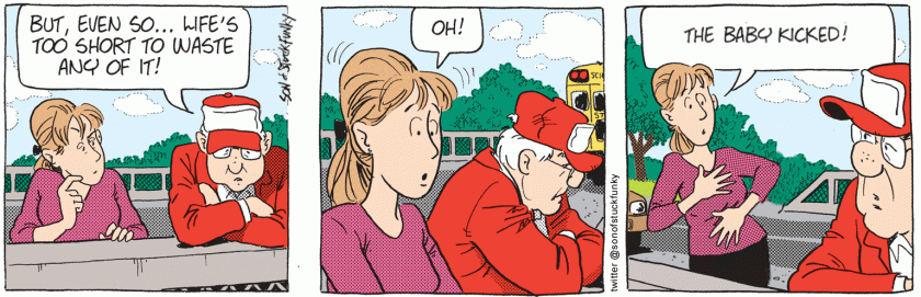 This out-of-left-field swerve would explain why she pulls over and says “Perfect ending to the worst day…” on Monday, since we never see the passenger side tires on her car, and her reaction to Ed’s comment in today’s strip. Also, it would be a clumsy and totally nonsensical attempt at a Shyamalan-like twist, which is why it would be right in Batiuk’s wheelhouse. I sincerely hope I’m wrong.