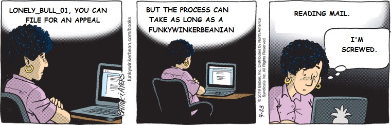 “Uh, hey Harley, say, there’s a very important book on Earth that we need to make certain gets written. It’s real important and everything. We’re finally going to give you a mission, Clarence, I mean Harley. What? Why are those guys over there giggling? Uh, well…they’re reading today’s Funky Winkerbean of course.”