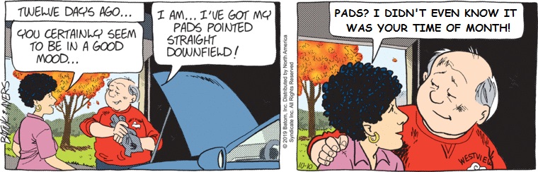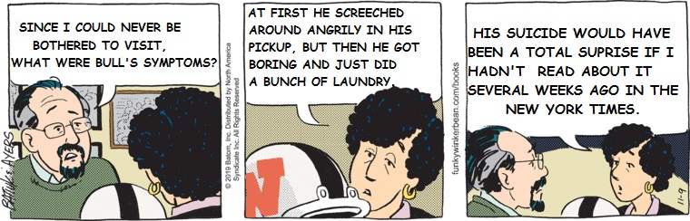 Mind you, this was Funky Winkerbean‘s final “prestige arc”, about the death of Bull Bushka from football-induced CTE. A too-minor and yet too-major subplot was about Linda seeking payment under the NFL’s real-life settlement plan for CTE sufferers, without Bull ever knowing about it. It was never explained why she needed this money; we saw the Bushkas do things like travel long distance for health care they could have gotten locally. Nor was it spoken of again after this.