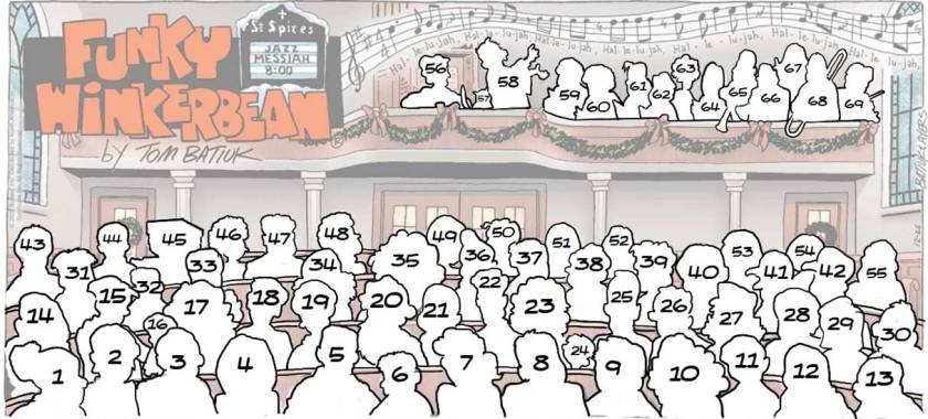 As confounding and confusing as this strip has been over these final months…you can’t say that a lot of effort wasn’t put into today’s strip, the last-ever Sunday panel of Funky Winkerbean. Nearly seventy people (and one cat) are packed into St. Spires. I was even able to recognize most of them…but there are a couple head-scratchers.