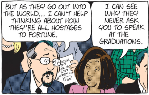 Speeches given at commencements, weddings, funerals, company meetings, etc, tend to focus on the good and the upbeat. We all know that the most beautiful girls were more popular than the smartest girls, the groom has a checkered past, the deceased was a terrible father, etc. It’s a social convention that we don’t speak of those things in these contexts.
