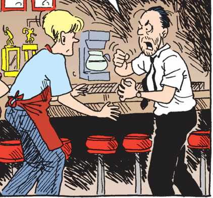 While Frankie’s sleaziness clearly makes him a fan favorite, that’s honestly all he has going for him. His schemes are always pathetic, and they are exemplified by one panel I remember, when Dullard was in Hollywood (Frankie was running the food truck) and Frankie is running across the street to talk to Dullard and he looks like a terribly brain-damaged person. (Sorry, don’t know the PC term.) (I only remember because it was one of my stints.)