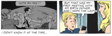 EXACTLY. How could Darin automatically know what his biological father was like, much less that he was Frankie? It would have been more realistic for him to be excited about the whole thing, only to be let down when he realizes “bio-Dad” is the guy who assaulted him as a kid. Maybe throw in a “YOU!” panel and a revamped flashback – the Batiuk specialty – for good measure. But the whole point was about bringing attention to Lisa’s Story, so…