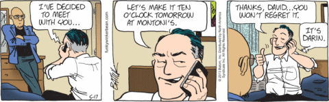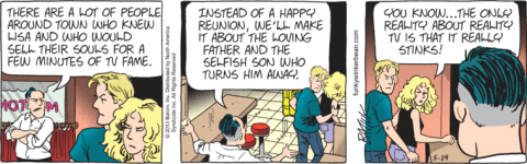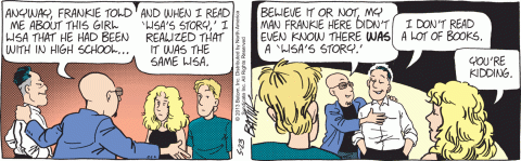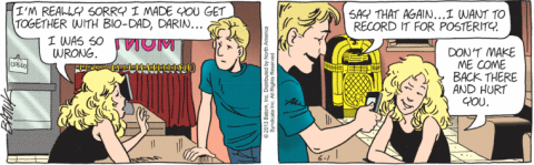 Weird that they decided to lessen the diversity in this Cracker Barrel of a strip. I’m going to guess that Batiuk and Ayers original conception of the character was white, and so they wrote angry letters to the colorist demanding a correction. Why they never go back and bother to correct all the times Rachel or Maddie are blonde on Sundays, I don’t know.