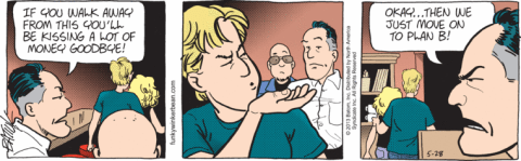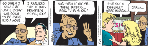I proceeded to give a brief rundown of how Funky Winkerbean had ended. I started with the grown up daughter of the woman who died of breast cancer coming home, saying she was going to write a book. I explained how she ended up talking with a time travelling janitor about how her book would lead to utopia, before she woke up wondering if it was all a dream. Then I told her that the last week jumped forward 60 some years to the girl’s granddaughter and daughter going to a bookstore, and ending on a closeup of the cancer book that the great-grandfather had written.