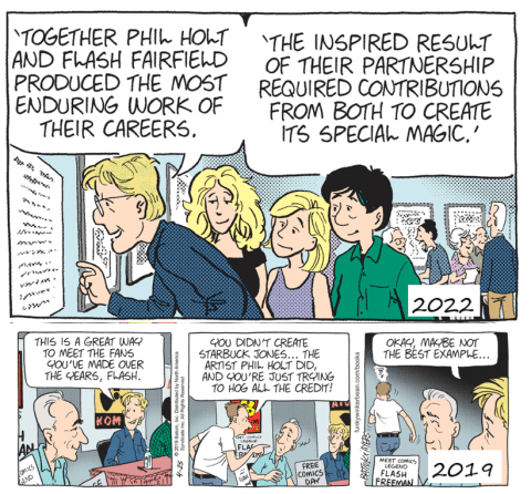 Batiuk did the barest minimum of work for Funky Winkerbean, and only because he got paid to do it. And he made every single part of his “day job” about comic books. He writes comic book stories into FW and CS, hires comic book artists to create the needless Sunday covers, used the (probably job-mandated) Funky Winkerbean blog to ramble about comic books, and goes to comic book conventions as his only method of fan engagement. The only other things he puts effort into are feeding his ego, and selling his crappy books.