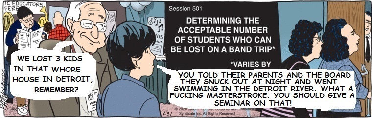 What’s the really annoying thing about all of the word salad is that Batiuk is laughing off something distressing. We have an old guy who either can’t hear very well and gets things wrong or who’s slowly sliding into dementia. Sure, he can cry havoc and let slip the dogs of huffing and puffing about gallows humor but it ain’t funny.