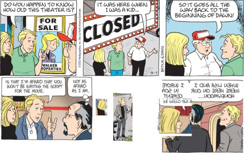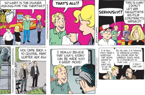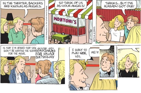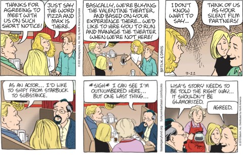 Of course, a better writer would have given the characters some “business” to do — in other words, some physical movement or task. Imagine what a cartoonist like Berke Breathed would have done. There’d be popcorn popping all over, or being collected and distributed in popcorn buckets as people talk, or the character would have reached into the popcorn machine, or there’d be some action going on with the fake-butter pump, or SOMETHING. In the table scenes, someone would be eating, or summoning the waiter, or examining the menu.