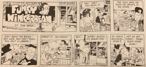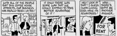 Of course, he isn’t Dead Skunk Head yet. Not in the 90’s. For the first several years of his tenure, he’s Pony Tail Head. And the first appearance I could find of him was that April 2, 1995 Sunday Strip where he is driving customers away by being surly and abrasive, as well as socially inept. A far cry from the genial and phlegmatic guy he was at the end of Act III.