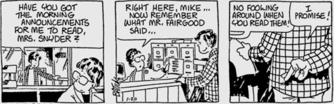 Mike was a student in Wally’s class, and the subject of a running gag where he would hijack the school announcements to practice his comedy routine.
